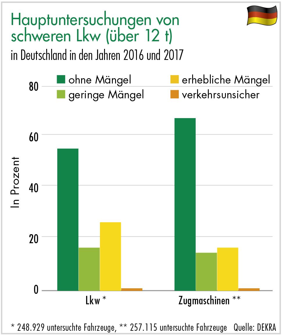 Diverse internationale Studien wie zum Beispiel die bereits erwähnte ETAC-Studie belegen, dass technische Fahrzeugmängel zu etwas mehr als fünf Prozent für Unfälle mit Güterkraftfahrzeugen verantwortlich sind. Auch hierbei ist von einer zusätzlichen Dunkelziffer auszugehen, da technische Fahrzeugmängel vor Ort in der Regel nur schwer oder gar nicht zu erkennen sind beziehungsweise in den meisten Fällen keine weitergehenden technischen Untersuchungen durch einen Sachverständigen stattfinden. Die niedrige Rate ist aber zweifelsohne auch ein Ergebnis des bestehenden Systems der Fahrzeugüberwachung mit qualifizierten Hauptuntersuchungen von Sachverständigenorganisationen wie DEKRA und anderen Dienstleistern.